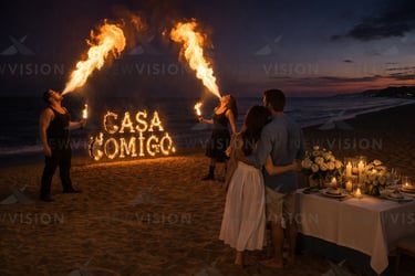Show de Fogo com Pedido: Espetáculo de fogo na praia. No final, letras em ferro espetadas na areia são acesas — "Casa comigo?". Visual brutal e único.