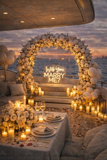 Jantar no Iate: Iate decorado com flores, balões e velas. Chefe privado, músico ao vivo. Opção de pernoita ou passeio noturno.